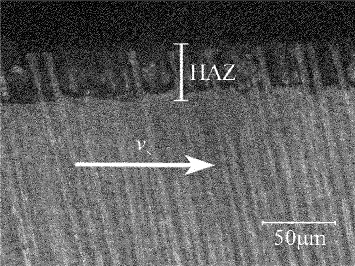 在激光功率為60W、重復頻率為0.4MHz、掃描速率為1m/s時,CFRP表面熱影響區如圖 4所示。從圖中可以看出,CFRP表層纖維的排布方式對熱影區有顯著影響,當掃描方向與表層纖維排布方向垂直時,熱影響區達70μm;當掃描方向與纖維排布方向一致時,材料表面幾乎沒有熱影區。主要是因為碳纖維的熱傳導率遠遠大于環氧樹脂的熱傳導率,未能達到CFRP燒蝕閾值處的脈沖能量沿著碳纖維方向傳播,所以當掃描方向與表層纖維排布方向一致時,沿著掃描方向傳播的能量與下一個脈沖能量共同用于去除CFRP材料,掃描深度也更大,對切縫兩側造成熱影響區較小;而當掃描方向與表層纖維排布方向垂直時,能量沿著掃描垂直方向傳播,切縫兩側熱量累積,對CFRP造成熱損傷,導致嚴重的熱影響區。
