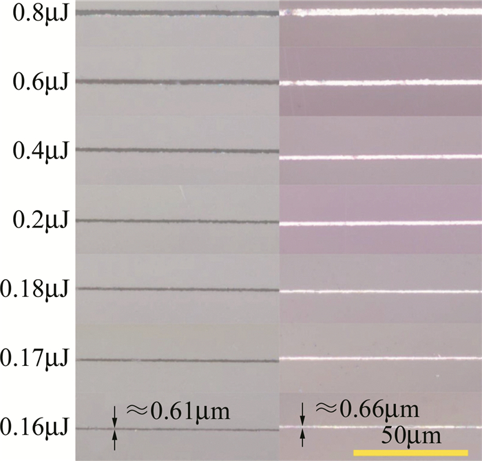 激光直寫刻蝕玻璃方法,按激光波長(zhǎng)不同主要分為紅外和紫外激光刻蝕法,而按照激光脈寬不同則可分為:連續(xù)激光刻蝕;納秒、皮秒及飛秒激光刻蝕。YANG等人使用248nm深紫外準(zhǔn)分子激光在石英玻璃表面刻蝕微通道,試驗(yàn)中發(fā)現(xiàn)激光能量密度是決定石英玻璃發(fā)生刻蝕及裂損的主要因素,無(wú)裂損刻蝕石英玻璃的激光能量密度閾值區(qū)間應(yīng)在16J/cm2~30J/cm2;而掃描次數(shù)的增加、重復(fù)頻率和微通道深度的增大也會(huì)加劇微通道的裂損程度,最后通過(guò)加工參量的優(yōu)化(激光能量密度23.5J/cm2,圓弧段重頻為50Hz,直線段重頻為40Hz,掃描1次)實(shí)現(xiàn)了寬度小于100μm的直線型(深度不大于50μm)和圓弧型微通道(深度不大于28.5μm)的無(wú)裂損刻蝕。LI等人利用波長(zhǎng)為355nm, 脈寬為10ns~25ns的全固態(tài)紫外激光器直寫刻蝕BF33硼硅玻璃微通道,試驗(yàn)中采用單一變量法探究激光能量密度、重復(fù)頻率、掃描速率等參量對(duì)刻蝕效果的影響,試驗(yàn)結(jié)果表明,當(dāng)激光能量密度過(guò)大時(shí),玻璃易發(fā)生嚴(yán)重崩邊裂損現(xiàn)象,刻蝕深度減小;而隨著重復(fù)頻率的減小,通道碎裂現(xiàn)象減輕,刻蝕深度增大。YU等人采用波長(zhǎng)為1030nm、脈寬和重復(fù)頻率分別為290fs, 50kHz的飛秒激光器在石英玻璃樣品上刻蝕線寬小于1μm的凹槽圖案以制備亞微米金屬線,研究了不同脈沖能量激光與燒蝕凹槽及機(jī)械拋光后的金屬線的線寬之間的關(guān)系,如圖 1所示。結(jié)果表明,當(dāng)脈沖能量在0.18μJ以下時(shí),凹槽線寬已降低至1μm以下,最終在石英玻璃上制備出多種不同圖案且線寬穩(wěn)定控制在0.8μm左右的凹槽。