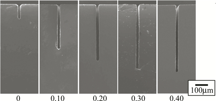 對(duì)于激光誘導(dǎo)背部濕法刻蝕,溶劑材料種類和激光工藝參量的選取都對(duì)刻蝕質(zhì)量有較大的影響。EHRHARDT等人以甲苯溶液為液體介質(zhì),采用355nm和266nm的皮秒激光對(duì)石英玻璃進(jìn)行刻蝕,發(fā)現(xiàn)甲苯溶液中芘的含量對(duì)去蝕率有較大影響,且在一定范圍內(nèi)芘的含量越高,去蝕率越大。KWON等人提出在使用波長(zhǎng)為1064nm、脈寬為100ns的近紅外激光刻蝕鈉鈣玻璃的過(guò)程中,可通過(guò)在吸收劑中加入磷酸抑制裂紋的產(chǎn)生,通過(guò)對(duì)比不同磷酸質(zhì)量分?jǐn)?shù)(0~0.40)的吸收劑刻蝕效果(如圖 5所示)發(fā)現(xiàn),加入磷酸后,可刻蝕深度提高了約5倍(從103μm提高到530μm),且側(cè)壁的粗糙度從0.55μm下降到0.16μm;此外,通過(guò)調(diào)整溶液中的磷酸濃度,可以制備出多種不同形狀及深寬比的微通道。SUN等人利用飛秒激光分別在空氣、水和乙醇中加工熔石英玻璃,結(jié)果表明,以乙醇為吸收介質(zhì)時(shí),熔石英玻璃的燒蝕閾值從2.22J/cm2降到了1.02J/cm2,進(jìn)一步研究發(fā)現(xiàn),刻蝕時(shí)乙醇比水需更低的激光能量便能達(dá)到形成等離子體的電子密度,同時(shí)激光誘導(dǎo)等離子體形成后會(huì)在液體中產(chǎn)生氣泡,酒精中的氣泡比水中的對(duì)石英表面的沖擊壓力更大。