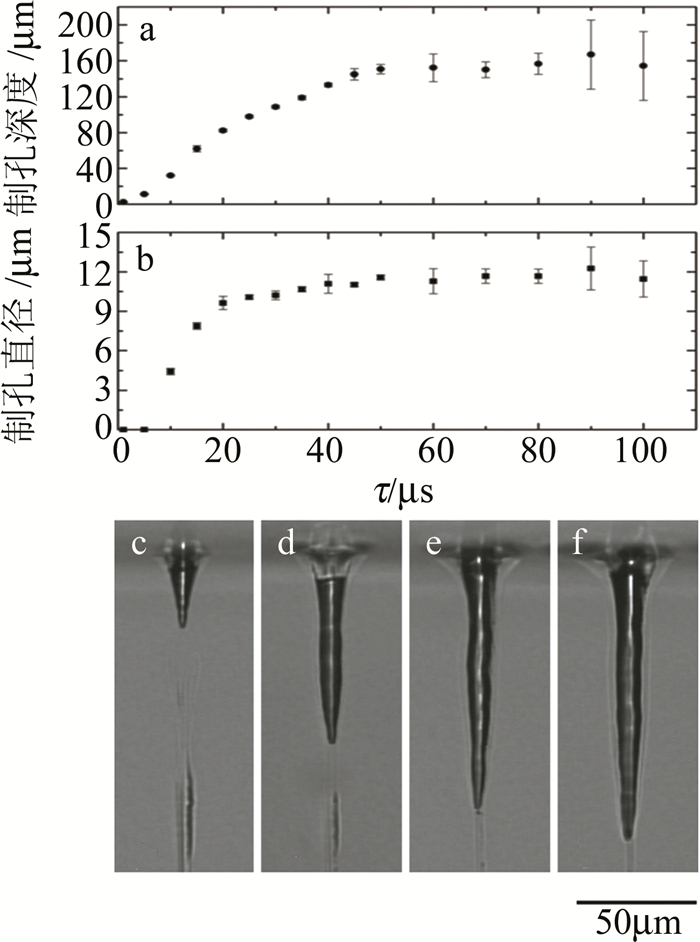針對(duì)激光打孔過(guò)程中玻璃崩邊及裂紋現(xiàn)象嚴(yán)重,高深徑比微孔加工難度大的瓶頸問(wèn)題,許多學(xué)者提出了改進(jìn)的打孔方法。為了減少微孔加工時(shí)裂紋的產(chǎn)生,KONO等人將二氧化鈰粉末和水的混合物涂覆到玻璃材料的表面后,晾干制成30μm的吸收層,之后再用波長(zhǎng)為355nm的納秒激光器進(jìn)行微孔加工,成功在硼硅玻璃和石英玻璃上分別加工出深徑比12以上的微孔,通過(guò)對(duì)照試驗(yàn)還發(fā)現(xiàn)該方法可以大大減少裂紋的產(chǎn)生,并在不影響加工質(zhì)量的前提下提高加工速度(XY工作臺(tái)進(jìn)給速率高達(dá)100μm/s)。針對(duì)飛秒激光打孔制孔速度低、制孔時(shí)易產(chǎn)生損傷的問(wèn)題,ITO等人[19]將波長(zhǎng)為780nm的飛秒激光器與波長(zhǎng)為1070nm的光纖激光器相結(jié)合,如圖 8a所示,加工時(shí)首先使用飛秒激光在玻璃基板上加工出高寬深比的細(xì)線,之后將光纖激光輻照到細(xì)線上逐步獲得所需的微孔(其中在飛秒激光輻照后的光纖激光輻照時(shí)間定義為時(shí)間延遲τ,如圖 8b所示), 研究發(fā)現(xiàn), 飛秒激光產(chǎn)生的細(xì)線會(huì)選擇性地吸收光纖激光脈沖利用熱效應(yīng)去除材料,可以有效地避免直接飛秒激光加工過(guò)程產(chǎn)生的強(qiáng)應(yīng)力波對(duì)材料的損傷,制孔的直徑和深度與τ有關(guān),如圖 9所示。試驗(yàn)結(jié)果表明,該方法在40μs內(nèi)加工出了直徑為10μm、深度達(dá)133μm的微孔,制孔速度只采用飛秒激光加工的5000倍以上, 且能有效地抑制裂紋的產(chǎn)生。為了解決傳統(tǒng)打孔由上至下的加工方式制孔時(shí)出現(xiàn)的坡度效應(yīng)(制孔開口表現(xiàn)出入口大出口小的特征),WANG等人[20]提出在加工透明材料時(shí),嘗試采用由下至上的打孔方式代替常規(guī)的由上至下方式,將激光透過(guò)材料聚焦于材料的下表面,由底部開始一層層地將材料向上去除, 試驗(yàn)中分別采用波長(zhǎng)為532nm的納秒激光、波長(zhǎng)為1064nm的皮秒激光及波長(zhǎng)為515nm的飛秒激光在康寧大猩猩玻璃上加工孔徑為100μm~120μm、深度為200μm~900μm的微孔, 試驗(yàn)結(jié)果表明,在采用由下至上的加工方式時(shí),脈寬區(qū)間不存在死亡谷(自納秒開始,脈寬愈短,材料移除率愈低,在2ns~50ps之間移除率非常低),脈寬為2ns~50ps的激光切割效率高于超快激光,能夠?qū)崿F(xiàn)零錐度鉆孔且玻璃的崩邊尺寸小于50μm。