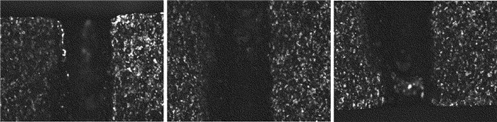 將復合脈沖激光打孔后的SUS 304不銹鋼厚板沿孔的軸向切割,在顯微鏡下觀察孔的剖面形態,如圖 3所示。由于不銹鋼板較厚而顯微鏡的視場較小,5mm長的孔徑形貌需分3段拍攝,從左至右分別為孔的上、中、下3段。從圖中可以看到,小孔的入口圓度較好,出口孔徑略小于入口,孔壁略粗糙且發黑,有重鑄層。